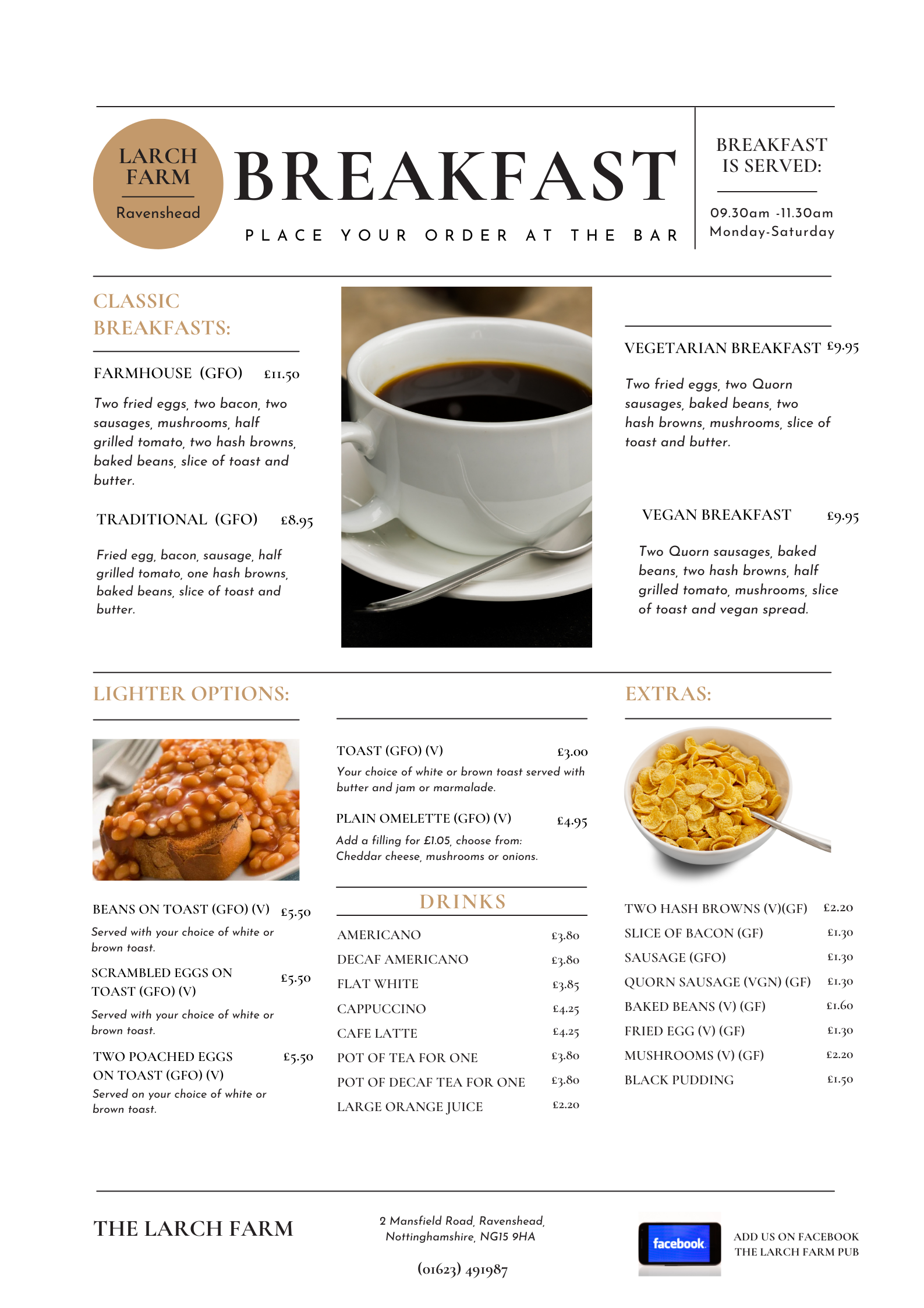 Welcome to our Menu page. Here, you can explore the delightful offerings we have at The Larch Farm. Whether you're looking for a hearty meal, a beautiful outdoor dining experience, we have something to suit your taste. Discover more about our services below to enlarge our menus please click the image.